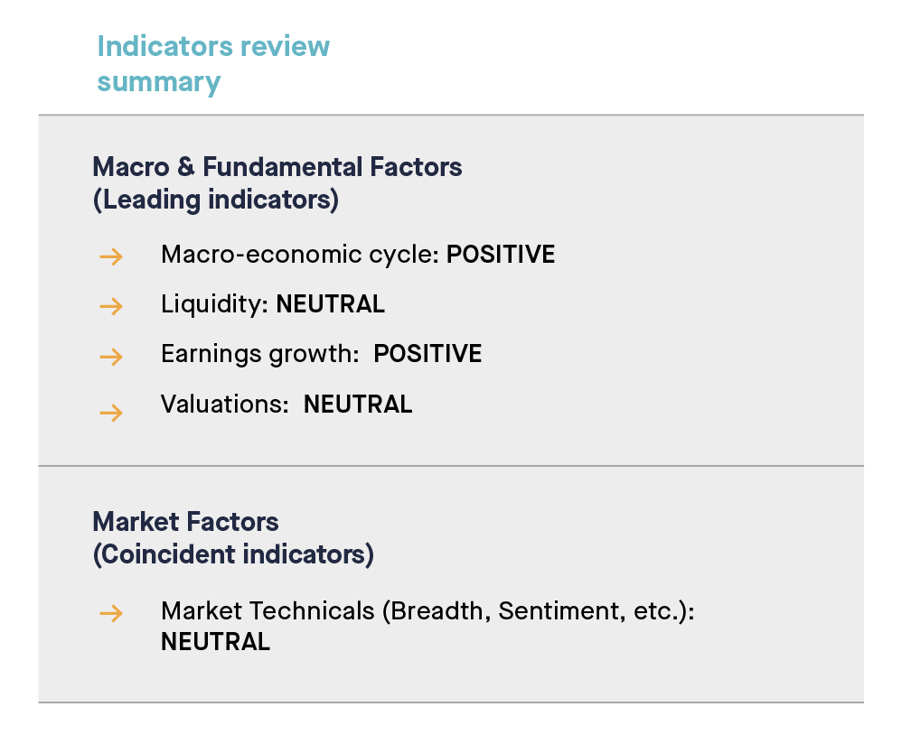 Successful investing needs thoughtfulness and composure, and we continue to rely on our macro, fundamental and market indicators instead of reacting ex-post to market action. Despite a potentially less supportive liquidity outlook in the months ahead, the weight of evidence leads us to maintain a positive stance on risk assets and equity in particular. Global growth remains above potential, financial conditions remain supportive, global earnings growth remains well oriented and some segments of the market remain reasonably valued. Our market technical indicators (trend, sentiment, etc.) continue to react rather nervously to recent market volatility but are not flashing red yet.